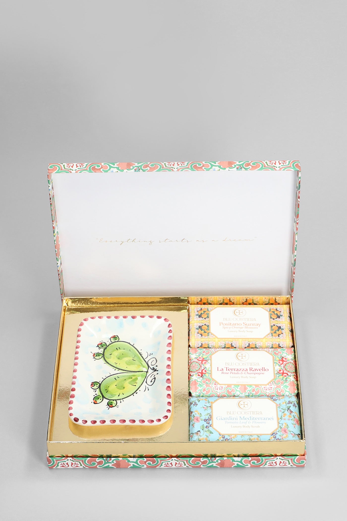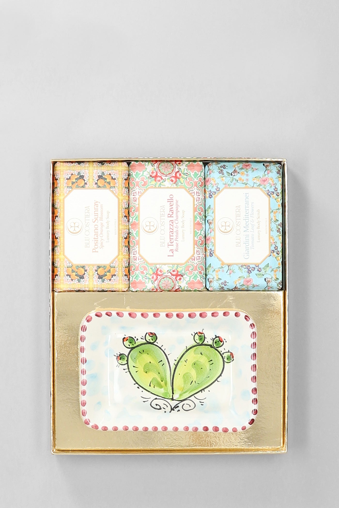 - Contains 3 solid soaps including a scrub and a handcrafted Vietri ceramic soap dish